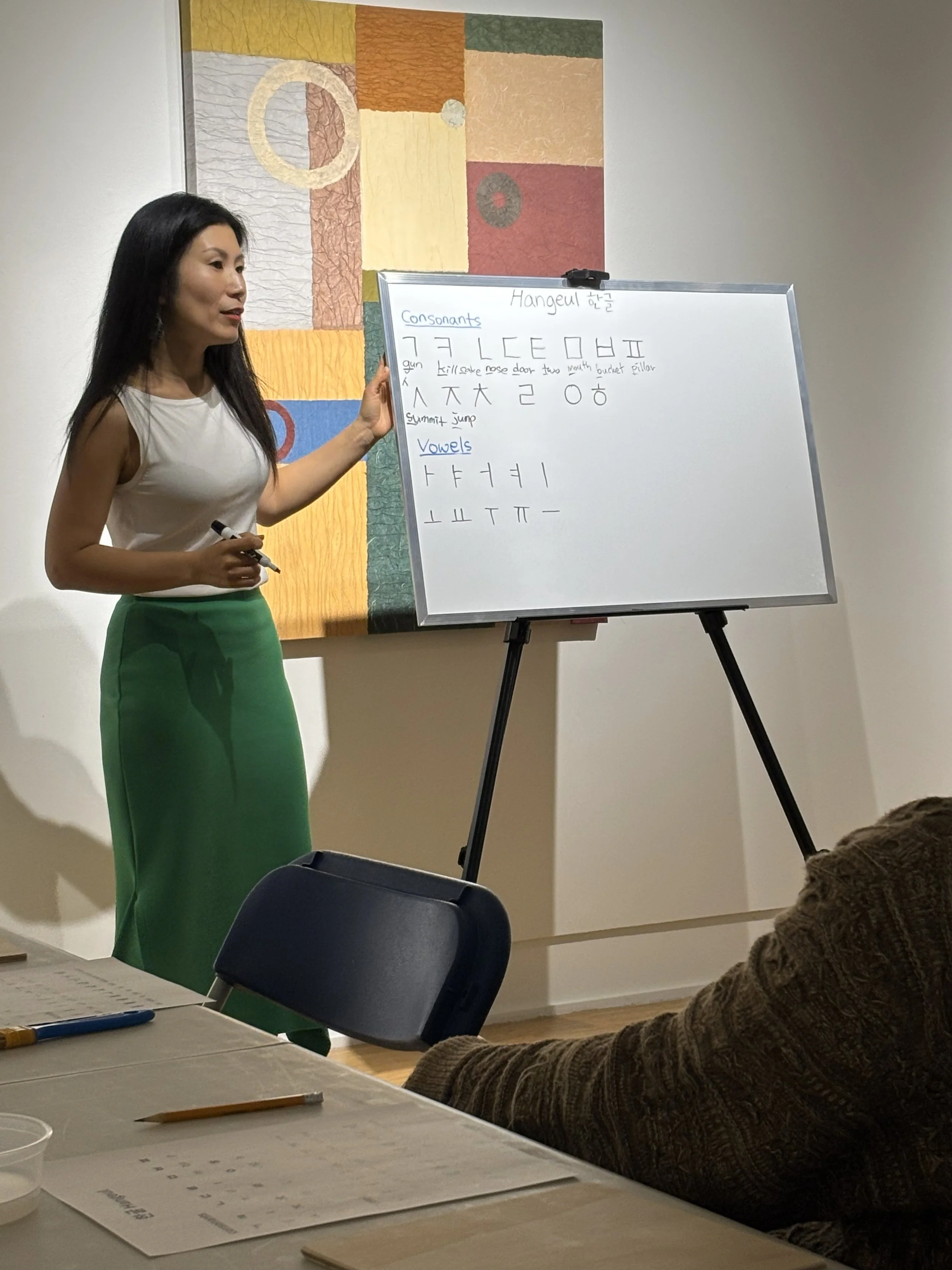 Participants are introduced to Hangul, the Korean writing system, and learn about Hanji, traditional Korean paper. They then create a personalized artwork incorporating meaningful words or messages in Korean.